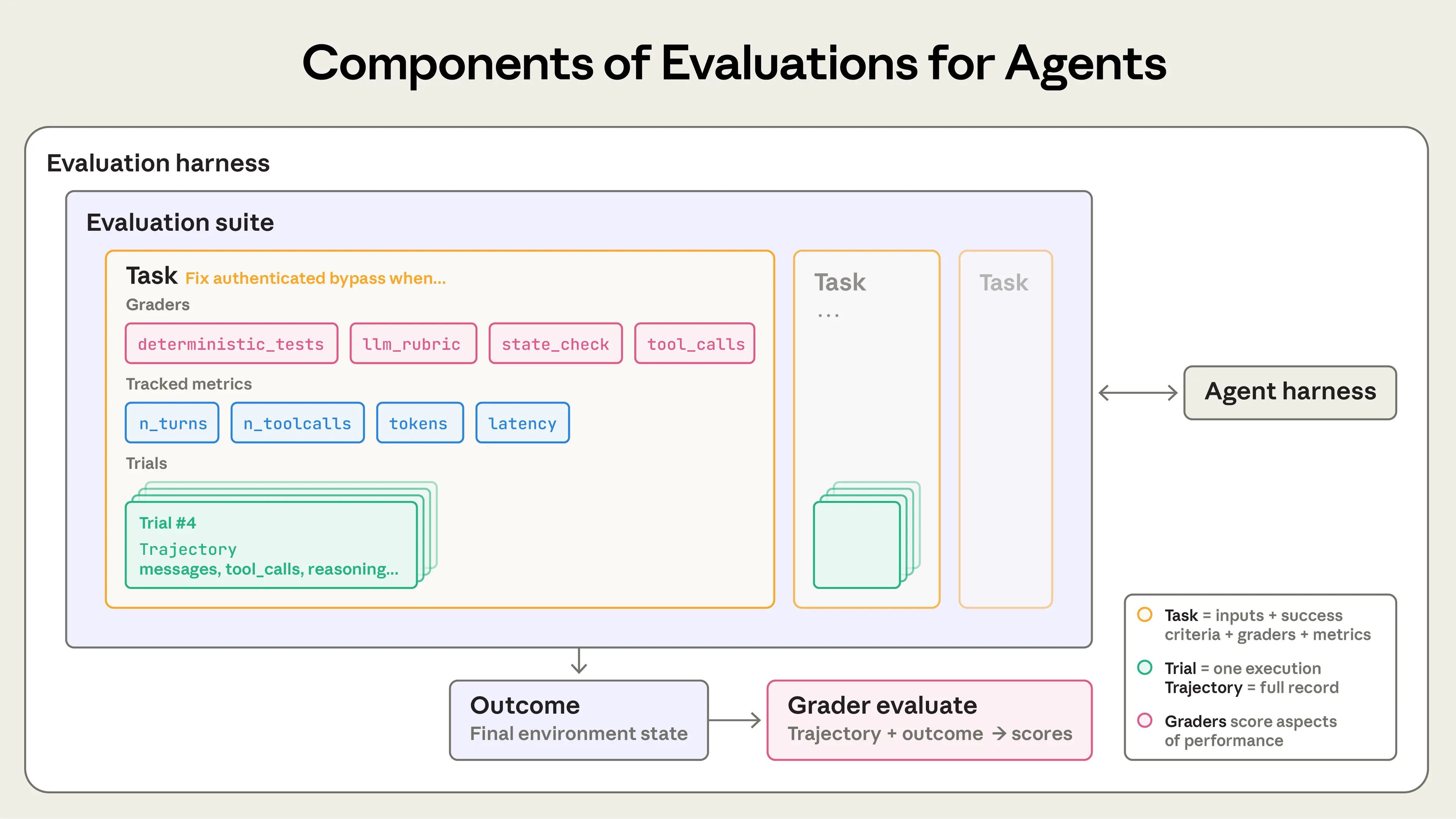- 评测框架(evaluation harness)是端到端运行评测的基础设施。它提供指令和工具、并行运行任务、记录所有步骤、评分输出并汇总结果。