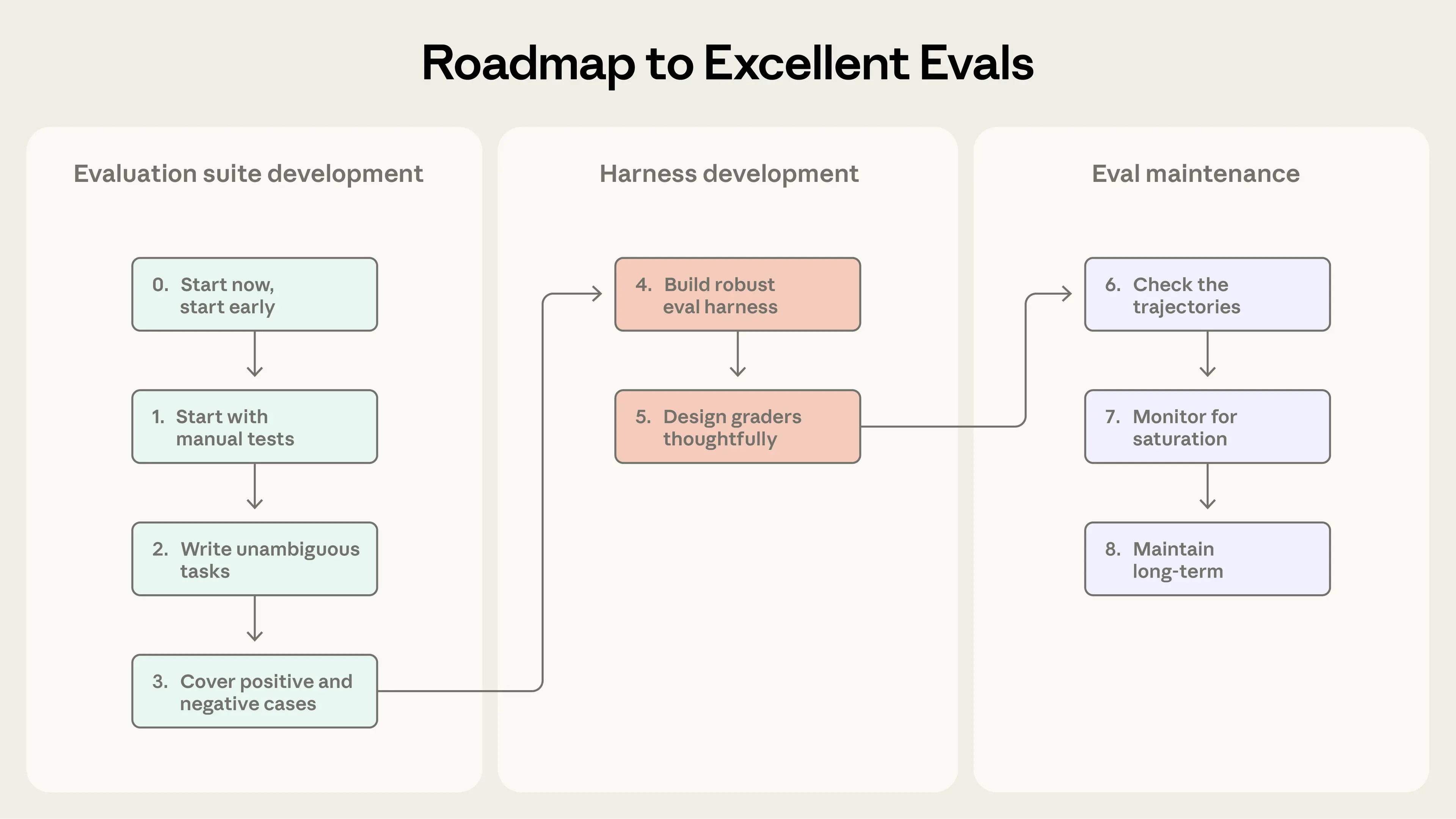 没有评测的团队会陷入被动循环——修复一个失败又引入另一个,无法区分真实回归与噪声。及早投入评测的团队则相反:开发更快,因为失败变成测试用例,测试用例阻止回归,指标取代猜测。评测为整个团队提供清晰的攀登目标,把“智能体变差了”转化为可执行行动。价值会复利增长,但前提是把评测当作核心组成,而非事后补救。