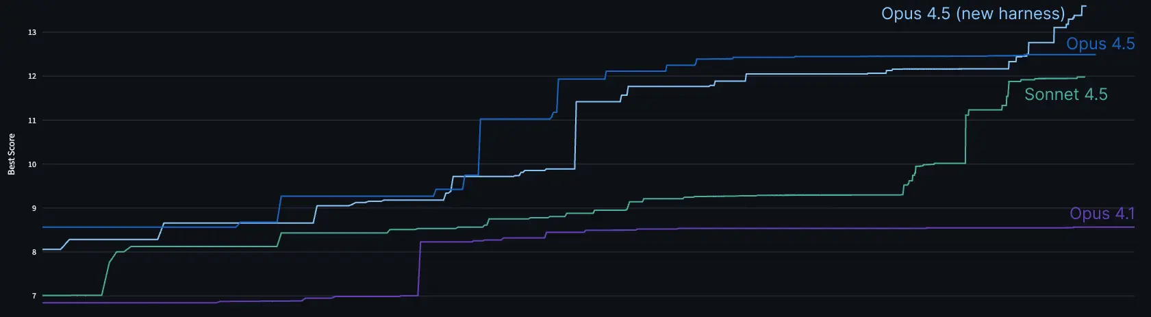 当我测试一个发布前的 Claude Opus 4.5 检查点时,我观看 Claude Code 用 2 小时在题目上工作,逐步改进它的解法。它解决了初始瓶颈,实施了所有常见微优化,并在不到一小时内达到我们的及格阈值。