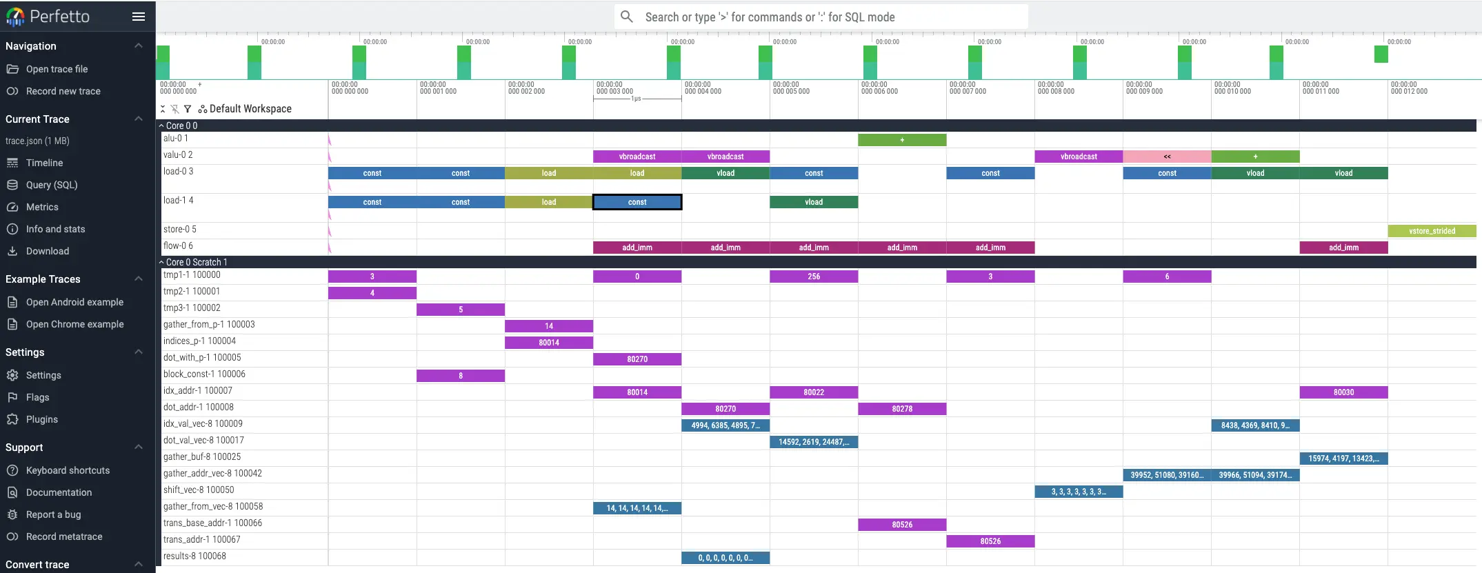 我构建了一个模拟加速器的 Python 仿真器,其特性类似于 TPU。候选人优化运行在这台机器上的代码,并使用一个热重载的 Perfetto trace 来展示每条指令,类似于我们在 Trainium 上使用的工具。