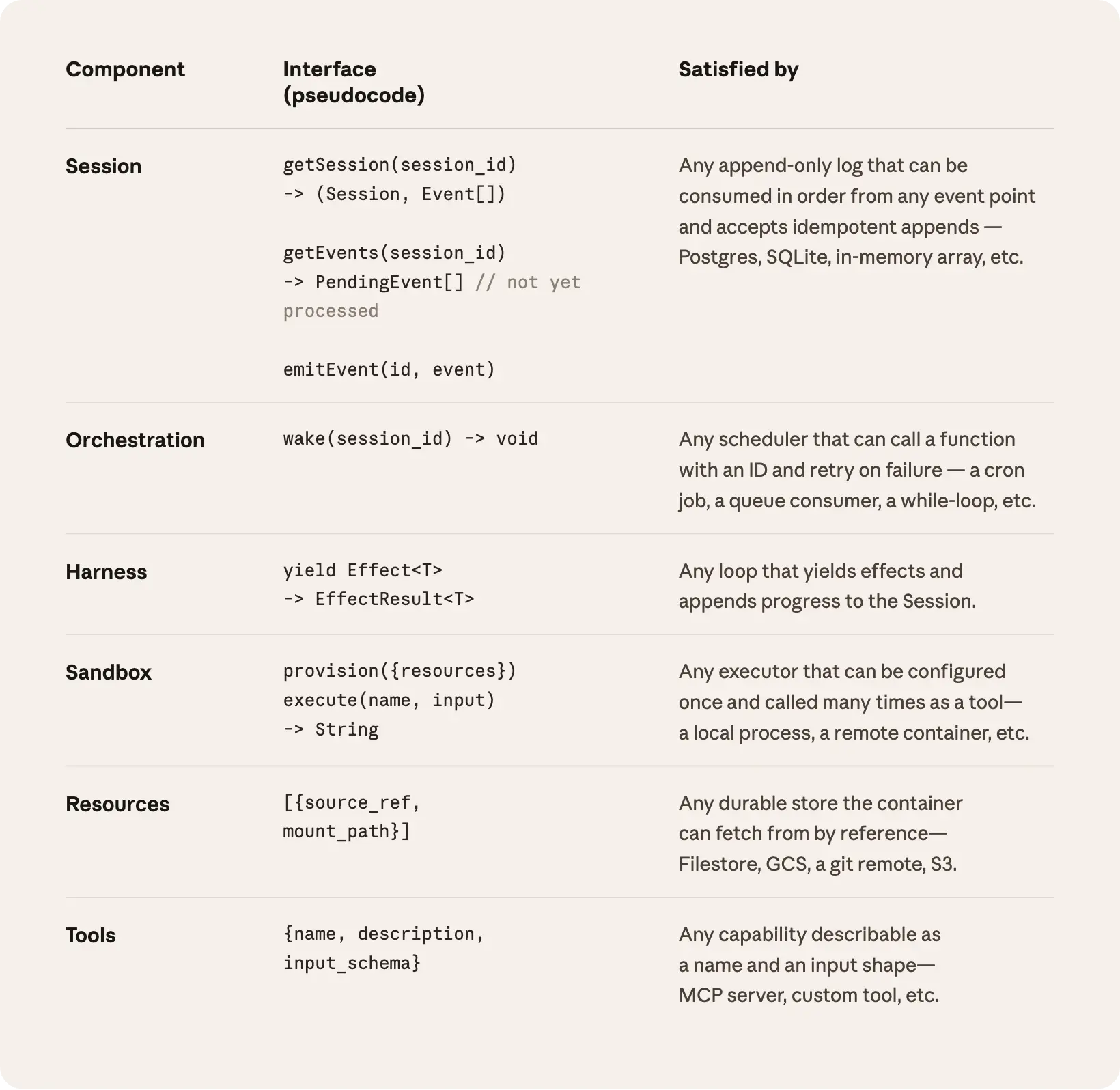 Managed Agents 遵循同样的模式。我们将代理的组成部分虚拟化了:session(记录所有发生事件的只追加日志)、harness(调用 Claude 并将 Claude 的工具调用路由到相关基础设施的循环),以及 sandbox(Claude 可在其中运行代码和编辑文件的执行环境)。这使得每个部分的实现都可以在不影响其他部分的情况下被替换。我们对这些接口的形态有明确主张,但并不限定其背后运行的具体实现。