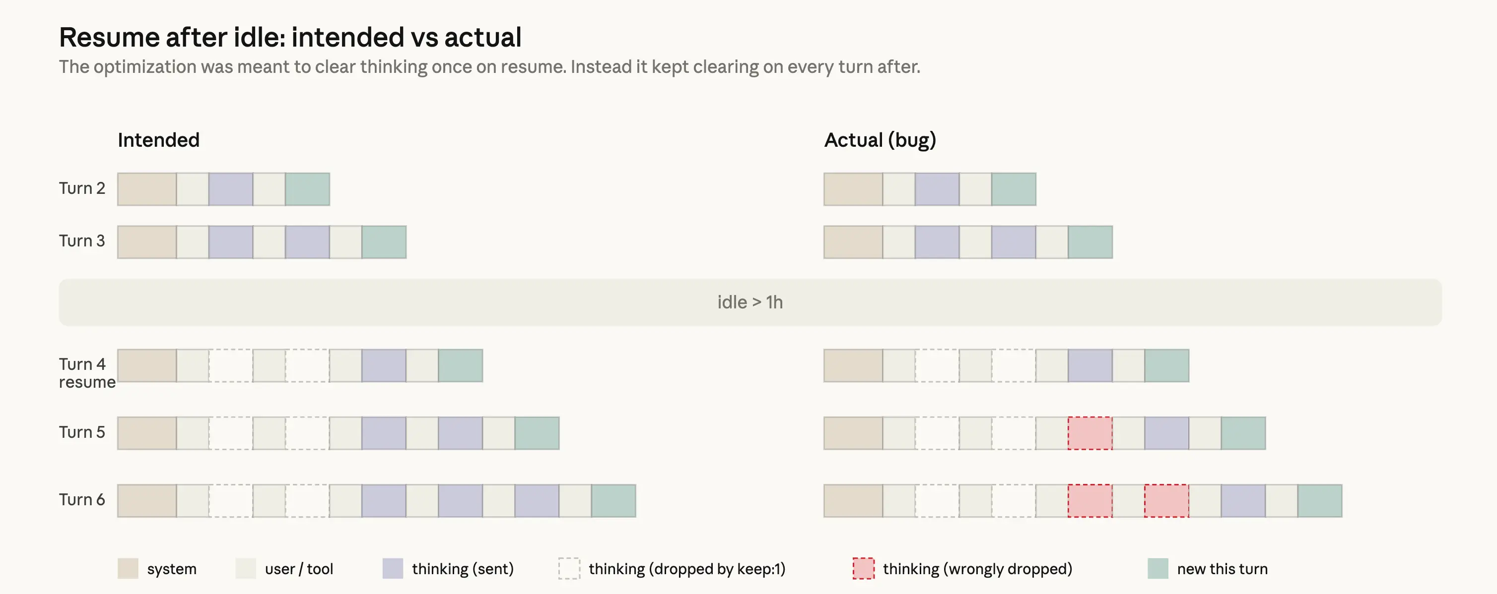 这个设计本应很简单:如果一个会话闲置超过一小时,我们就可以通过清除旧的思考片段来降低用户恢复该会话的成本。由于这次请求无论如何都会是一次缓存未命中,我们可以从请求中裁剪不必要的消息,以减少发送给 API 的未缓存 token 数量。之后我们会恢复发送完整的推理历史。为此,我们使用了 clear_thinking_20251015 API header,并配合 keep:1。