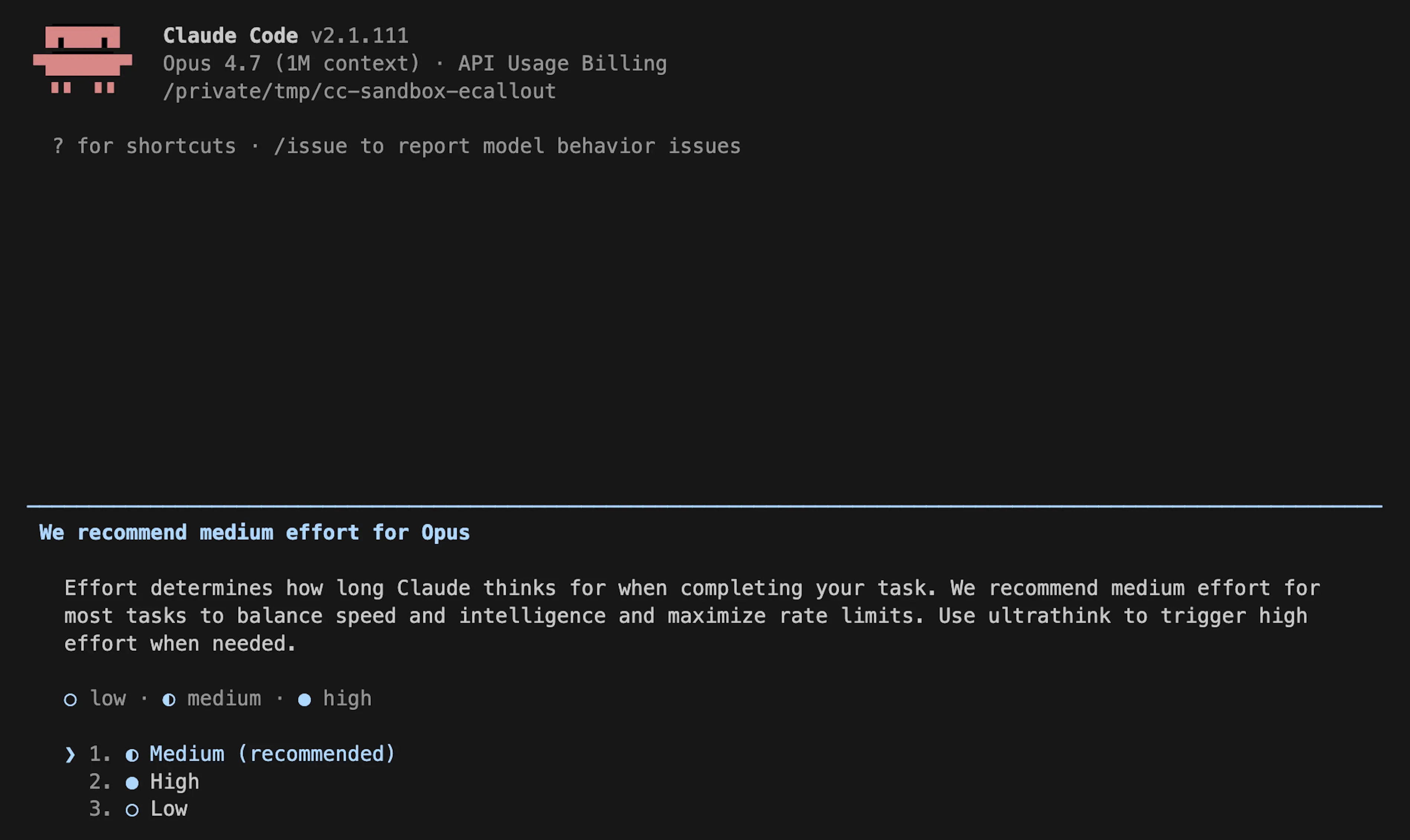 在变更推出后不久,用户开始反馈 Claude Code 感觉没那么聪明了。我们进行了多轮设计迭代,以更清楚地展示当前的强度设置,从而提醒用户他们可以更改默认值(包括启动时提示、内联强度选择器,以及重新加入 ultrathink),但大多数用户仍然保留了 medium 这一默认强度。